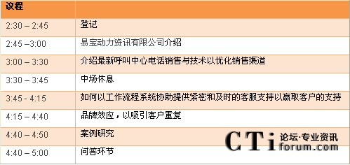 易寶動力資訊有限公司誠摯邀請您出席2010年1月22日舉行的研討會,在此將展示易寶的偉思聯(lián)絡中心CRM解決方案結合全面化工作流程和服務臺功能,如何有助您擴大銷售渠道,贏取客戶支持,微調市場預測及提升品牌以吸引忠誠客戶的支持。