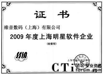 CTI論壇(ctiforum)10月19日消息: 金秋十月,捷報頻傳,由上海市軟件行業(yè)協(xié)會開展的2009年度上海明星軟件企業(yè)評選結(jié)果出爐,維音數(shù)碼不僅榮登:“2009年度上海明星軟件企業(yè)(經(jīng)營型)”和“2009年度上海明星軟件企業(yè)(創(chuàng)新型)”獲獎榜單,維音數(shù)碼自主研發(fā)的軟件產(chǎn)品VisionCTI(計算機電話集成系統(tǒng))更是被評定為“2009年度上海市優(yōu)秀軟件產(chǎn)品獎”。