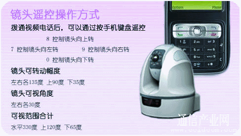 前端攝像頭可以上下左右靈活轉動,隨意安放在家中、商鋪中的合適位置。用戶的手機無需安裝客戶端軟件,即可通過視頻電話直接呼叫前端攝像頭,然后通過12個數(shù)字鍵控制前端云臺轉動、變焦、錄像、回放等操作。