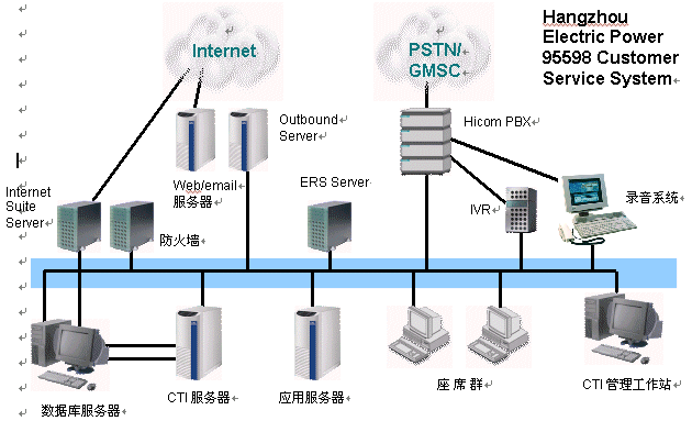 西門子Hicom 350E,作為杭州電力"95598"客服系統(tǒng)的通信服務器,以其出色的品質和強大的功能保證了整個系統(tǒng)的正常運行。同時充分利用杭州電力局原有的通訊線路,創(chuàng)新性的在原有的SDH(同步數字體系)網絡上利用HiPath HG 3200遠端模塊,將中心的人工坐席延伸到了五個郊縣電力公司,真正解決了全市統(tǒng)一接入,一個號碼對外,業(yè)務本地受理的問題;同時遠端坐席的工作方式真正做到和中心完全一致,給使用、管理、培訓等帶來極大的便利。