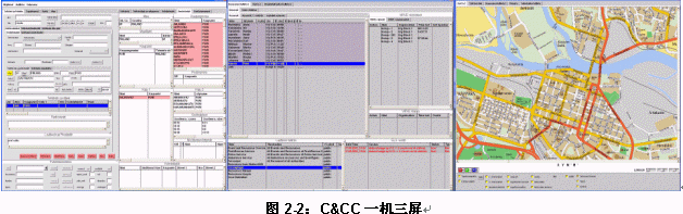 - 一機三屏:一屏CAD,另一屏為GIS,第三屏專用于資源調(diào)度。與雙屏配置相比,三屏配置的優(yōu)勢在與資源調(diào)度更加直接、快捷,同時更可以整合無線調(diào)度通訊資源。但是三屏配置需要較復(fù)雜的客戶化工作。