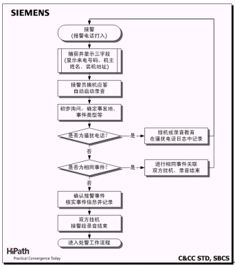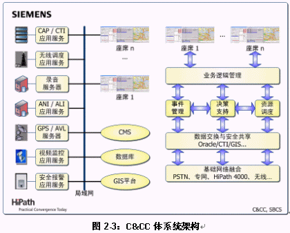 C&CC是西門子指揮控制中心全面解決方案的核心。C&CC以有線(HiPath 4000)/無線(模擬和數(shù)字集群)通訊平臺為信息采集和資源調(diào)度基礎(chǔ),系統(tǒng)核心模塊包括:融合多種業(yè)務(wù)的接處警工作流,面向地理信息對象的資源管理,面向事件的案情與錄音管理,基于預(yù)案的輔助決策支持,以及多種統(tǒng)計、查詢和報表生成工具等。在此基礎(chǔ)上,C&CC還提供豐富的接口,確保與技防報警、圖像/視頻監(jiān)控和GPS