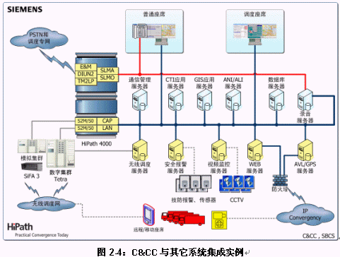 錯誤!未找到引用源。是關(guān)于C&CC最一般的系統(tǒng)集成實例。從圖中不難看出:C&CC對其它子系統(tǒng)提供了豐富的接口以保證系統(tǒng)與系統(tǒng)之間的互通、互連,而且是這些接口都是標準化的。作為面向公安"三警合一"的標準化的解決方案,C&CC的設(shè)計根本目標是提供盡可能豐富而標準化的功能與接口以壓縮系統(tǒng)部署周期,這個目標實際上是與經(jīng)費相對受限制用戶的利益是一致的。