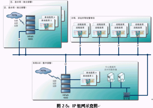 圖 2-5給出了使用純IP實施城市110組網(wǎng)的最普遍的示意。從該圖可以看出,無論采用集中接警還是分散處警,C&CC特別使用于使用純IP技術(shù)實施全市(包括所轄縣級市)110組網(wǎng)?紤]到目前全國公安二、三、四級網(wǎng)建設(shè)日漸成熟,使用純IP技術(shù)實施全市110組網(wǎng)并實現(xiàn)"三警合一"確實是經(jīng)濟、靈活而方便的選擇,前文提到的芬蘭112全國組網(wǎng)使用的也是這樣的技術(shù)。當(dāng)然,現(xiàn)存的傳統(tǒng)公安通訊專網(wǎng)仍然可以作為備份話務(wù)路由存在。