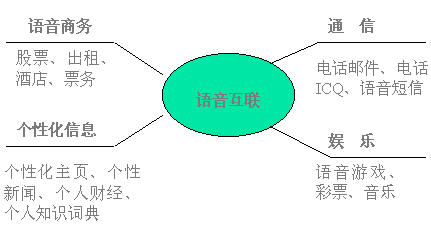 在中國,電話有著最廣泛的用戶群;追求方便時尚,希望使用互聯(lián)網(wǎng)信息、郵件而不懂或不熟悉鍵盤操作的用戶占4/5;語音互聯(lián)網(wǎng)是電話網(wǎng)與互聯(lián)網(wǎng)的完美結合,通過語音互聯(lián),普通電話用戶用自然語言對話的方式即可獲取互聯(lián)網(wǎng)的主要服務,滿足用戶任何時間、任何地點、任何設備獲取信息的需求。在美國、日本,語音互聯(lián)已成為簡易終端接入互聯(lián)網(wǎng)的主要方式之一。