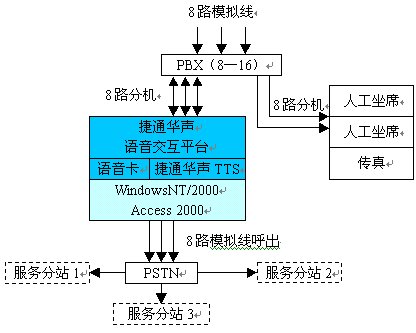 適用于中小型企事業(yè)單位的分布式客戶服務系統(tǒng)。特點是一半的線路資源用于交互系統(tǒng),另一半線路資源用于向分布下達服務指令。采用該方案的最大好處就是用戶的服務請求能夠以最快的速度自動分配到最合適的服務分站中,再由服務分站根據(jù)客戶的具體要求執(zhí)行服務。