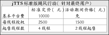 jTTS標準版在聲音質(zhì)量、聲音平滑度、自然度等方面已具有比較高的實用化水平。為了真正啟動語音技術的應用市場,捷通華聲啟動“颶風行動”,在活動期間為最終客戶、系統(tǒng)集成商制定了一個極具競爭力的價格,并且無平臺費。這次活動主要針對CTI領域中大量中小型系統(tǒng)的應用開展此次活動,目的是讓先進的技術能夠被更多的用戶采用,為系統(tǒng)集成商應用TTS技術提供了很高的利潤空間。