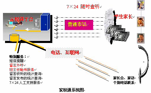 捷通華聲從關(guān)愛青少年成長出發(fā),提出了應(yīng)用于教育領(lǐng)域溝通平臺"家校通"系統(tǒng)的語音服務(wù)解決方案。家校通系統(tǒng)是一個融合了語音合成、計算機(jī)網(wǎng)絡(luò)集成綜合服務(wù)、互聯(lián)網(wǎng)、數(shù)據(jù)庫等多種先進(jìn)IT技術(shù)為一體的新一代家校聯(lián)系工具。它充分利用互聯(lián)網(wǎng)與目前最為普及的公眾電話等資源,為學(xué)校提供多樣化的信息發(fā)布渠道,同時強(qiáng)大的7×24小時的留言發(fā)布和查聽服務(wù)功能,為老師和家長提供一種全新、高效、便捷的交流方式,大大提高了家長的滿意度,提升了學(xué)校的管理實力。