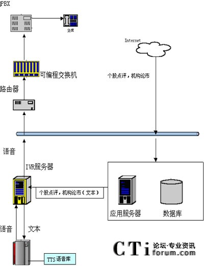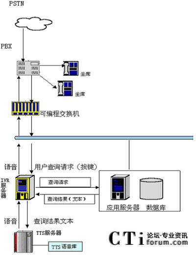 在技術(shù)上,用戶可以通過電話提交他的查詢請(qǐng)求(比如使用按鍵方式),IVR服務(wù)器收到請(qǐng)求后會(huì)向其他應(yīng)用服務(wù)器提交此查詢請(qǐng)求,當(dāng)IVR得到查詢結(jié)果后,他會(huì)將文本形式的查詢結(jié)果交給jTTS服務(wù)器,jTTS服務(wù)器會(huì)返回查詢結(jié)果的語(yǔ)音形式,最終語(yǔ)音會(huì)在坐席上播放,用戶就可以聽到他剛才所要查詢的信息。(如圖所示)