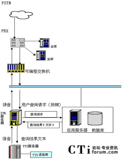 用戶撥打統(tǒng)一特服號碼進入客戶服務(wù)系統(tǒng),經(jīng)過自動語音系統(tǒng)提示,選擇公共信息查詢項目。用戶可以通過電話提交他的查詢請求(比如使用按鍵方式),IVR服務(wù)器收到請求后會向其他應(yīng)用服務(wù)器提交此查詢請求,當(dāng)IVR得到查詢結(jié)果后,他會將文本形式的查詢結(jié)果交給jTTS服務(wù)器,jTTS服務(wù)器會返回查詢結(jié)果的語音形式,最終語音會在坐席上播放,用戶就可以聽到他剛才所要查詢的信息。