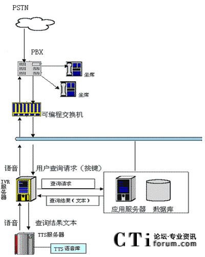 用戶可以通過(guò)電話提交他的查詢請(qǐng)求(比如使用按鍵方式,提交個(gè)人卡號(hào)等),IVR服務(wù)器收到請(qǐng)求后會(huì)向其他應(yīng)用服務(wù)器提交此查詢請(qǐng)求,當(dāng)IVR得到查詢結(jié)果后,他會(huì)將文本形式的查詢結(jié)果交給jTTS服務(wù)器,jTTS服務(wù)器會(huì)返回查詢結(jié)果的語(yǔ)音形式,最終語(yǔ)音會(huì)在坐席上播放,用戶就可以聽(tīng)到他剛才所要查詢的信息。