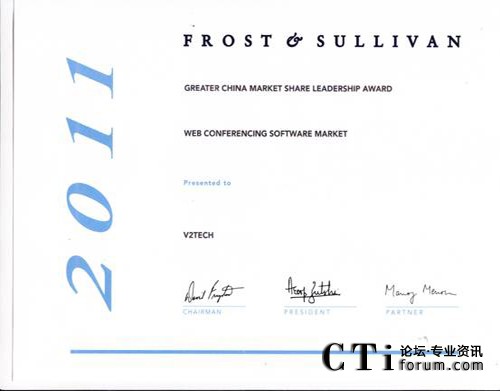 CTI論壇(ctiforum)1月12日消息(記者 浩宇):全球領(lǐng)先的Web會議解決方案供應商V2威速宣布,榮獲全球領(lǐng)先咨詢公司Frost&Sullivan頒發(fā)的“大中華區(qū)Web軟件會議市場份額領(lǐng)導者”殊榮。Frost & Sullivan設立該獎項旨在表彰各個行業(yè)領(lǐng)域在過去一年業(yè)績表現(xiàn)最佳并占有最高市場份額的企業(yè)。
