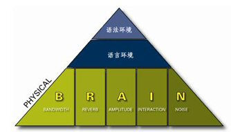 要達到清晰易懂的談話效果需要五個要素的配合:帶寬(Bandwidth)、回響(Reverberation)、振幅(Amplitude)、交互性(Interaction)、噪音水平(Noise)。任何一個會議系統(tǒng)的職責就是自動調(diào)節(jié)和平衡這五個要素,使進行交談的雙方都盡可能獲得最佳的聽覺享受。在英文里,我們可以用每個單詞的首字母來記憶這五個特征,即:BRAIN模型。