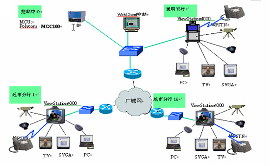 云南省中國銀行主會(huì)場(chǎng)放置1臺(tái)MGC-100 MCU和1臺(tái)視訊會(huì)議終端ViewStation4000,1套雙流模塊;其他16個(gè)地市各放置1臺(tái)視訊會(huì)議終端ViewStation4000,1套雙流模塊。MCU和視訊終端通過以太網(wǎng)交換機(jī)接入傳輸網(wǎng)絡(luò),根據(jù)各分地市網(wǎng)絡(luò)實(shí)際帶寬,視頻會(huì)議的帶寬定為2M。