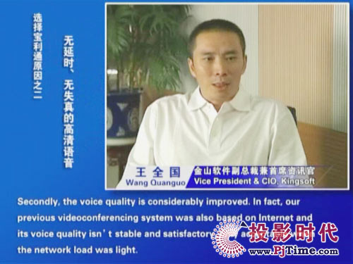 金山軟件副總裁兼首席資訊官王全國(guó)先生說(shuō)道:“對(duì)于軟件行業(yè)來(lái)說(shuō),及時(shí)、高效的溝通是保持競(jìng)爭(zhēng)優(yōu)勢(shì)的重要前提。相比之前使用的標(biāo)清產(chǎn)品,寶利通高清視頻會(huì)議系統(tǒng),提供了完全不同的體驗(yàn),流暢的高清晰畫(huà)面猶如真實(shí)的面對(duì)面溝通。而且我們公司并沒(méi)有申請(qǐng)專線,所有的應(yīng)用都是基于公網(wǎng)實(shí)現(xiàn)的。另一方面,新型全中文定制菜單的運(yùn)用,令我們使用起來(lái)非常方便,這更提高了我們使用視頻通信手段實(shí)現(xiàn)異地溝通的熱情!