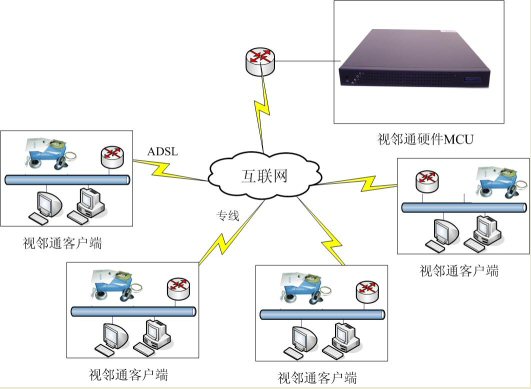 視鄰?fù)ㄏ到y(tǒng)采用軟硬結(jié)合的解決方案思想進(jìn)行設(shè)計(jì),主要組成是一個(gè)MCU,依據(jù)點(diǎn)數(shù)配備軟件終端,軟件終端含一個(gè)帶云臺(tái)可遠(yuǎn)程遙控的攝像頭,以及一個(gè)自帶回音消除的全向麥與小音箱。和傳統(tǒng)323產(chǎn)品比較,部署簡(jiǎn)單,靈活,在互聯(lián)網(wǎng)表現(xiàn)效果良好,并具備強(qiáng)大的數(shù)據(jù)功能,同時(shí)價(jià)格更具競(jìng)爭(zhēng)力,而純軟視頻會(huì)議系統(tǒng)相比,則在穩(wěn)定性,清晰度上更勝一籌。