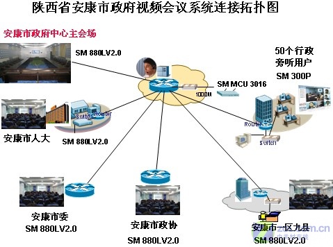 讓安康市政府尤為滿意的是,瑞福特的專業(yè)服務(wù)團(tuán)隊(duì),為其量身定制了最適合的解決方案:1臺MCU 3016視頻會(huì)議服務(wù)器放在機(jī)房;15臺視頻會(huì)議硬件終端SM880L部署在市中心會(huì)場以及各縣級政府會(huì)議室;50套軟件終端SM300安裝在PC和筆記本電腦上,輕松實(shí)現(xiàn)了安康市政府各項(xiàng)視頻會(huì)議應(yīng)用以及緊急事件的應(yīng)急指揮和溝通。