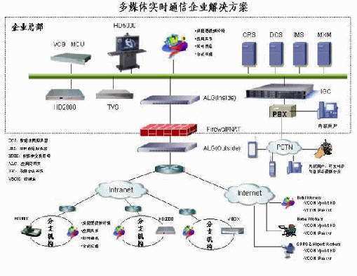 VCON提供了以HD系列的視頻終端產(chǎn)品和以VCB系列的多點(diǎn)控制單元(MCU)產(chǎn)品來(lái)構(gòu)建基于IP網(wǎng)絡(luò),采用H.323協(xié)議作為標(biāo)準(zhǔn)協(xié)議的視頻通信解決方案。通常主會(huì)場(chǎng)選擇會(huì)議室型終端HD5000,該終端在64Kbit/s下就可以實(shí)現(xiàn)畫(huà)面流暢的動(dòng)態(tài)雙流;主會(huì)場(chǎng)也可以選擇機(jī)架式會(huì)議終端HD2000,這樣主會(huì)場(chǎng)可以選配正裝和吊裝攝像機(jī),拍攝會(huì)場(chǎng)不同角度的場(chǎng)景;多點(diǎn)控制單元(MCU)選擇VCB3000,同時(shí)可以為領(lǐng)導(dǎo)、個(gè)人桌面或者出差用戶單獨(dú)配置支持H.323標(biāo)準(zhǔn)的Vpoint HD軟終端,該終端是目前業(yè)界惟一支持H.264、雙流、組播接受以及遠(yuǎn)程控制的軟終端產(chǎn)品。