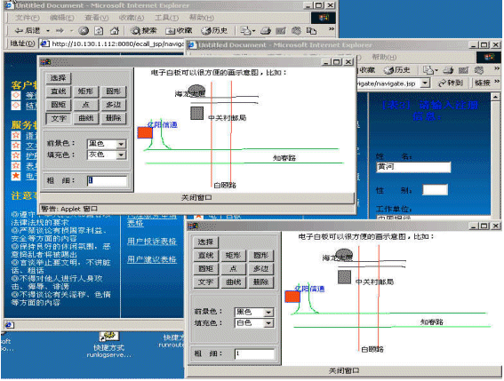 電子白板功能是在語音文字交談之外,ICWEB為用戶提供的圖形交談工具。電子白板允許多個(gè)在線用戶同時(shí)在界面里繪制刪除任意圖形,寫字、插入圖片以及用標(biāo)志工具標(biāo)示某些區(qū)域。電子白板功能可以有效地補(bǔ)充文本交談功能所不具備的圖示功能。