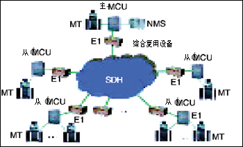多點視頻會議系統(tǒng)主要由視聽多媒體會議終端MT、通信傳輸網(wǎng)絡SDH、網(wǎng)絡節(jié)點的多點控制單元MCU、網(wǎng)絡管理系統(tǒng)NMS以及外圍設備等幾部分組成。由于通信網(wǎng)絡不同,會議電視系統(tǒng)的終端和多點控制單元MCU也不盡相同。例如,對于采用電路交換通信網(wǎng)絡的多點會議系統(tǒng)通過MCU實現(xiàn),而包交換通信網(wǎng)絡則通過多點會議服務器來實現(xiàn)多方會議。如圖: