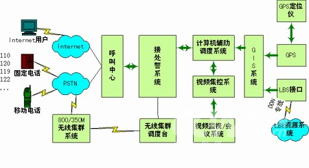 本系統(tǒng)實(shí)現(xiàn)接警、處警功能。接警中心統(tǒng)一接聽(tīng)和處理市民的報(bào)警、求助電話,市民可以通過(guò)電話撥打110、119、120、122等緊急特服號(hào)碼或只撥打統(tǒng)一的特服號(hào)碼(或通過(guò)Internet方式)向系統(tǒng)求助;處警中心接收接警中心轉(zhuǎn)發(fā)的警情數(shù)據(jù),并借助地理信息系統(tǒng)的定位、空間分析功能,對(duì)所有的資源和警力通過(guò)一體化的數(shù)據(jù)傳輸和通訊調(diào)度臺(tái)進(jìn)行方便的統(tǒng)一管理、指揮和調(diào)度。