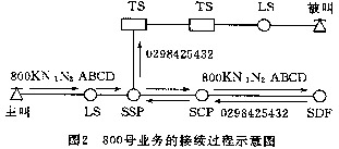 --用戶在撥打800號業(yè)務(wù)用戶號碼時,首先由網(wǎng)絡(luò)點上的普通電話交換機接收,并把800KN1N2ABCD號碼經(jīng)話路傳送給業(yè)務(wù)交換點SSP,再由SSP將此號碼經(jīng)No.7信令鏈路送到業(yè)務(wù)控制點SCP,SCP通過在業(yè)務(wù)數(shù)據(jù)庫SDP中查尋譯碼表將此號碼翻譯成普通的電話號碼回送SSP,最后由SSP負責完成電路的連接,該過程如圖2所示。
