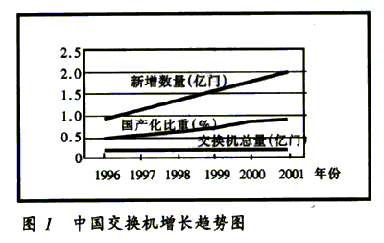 2000年,中國公用通信網上局用程控交換機的總容量達到1.79億門,國內生產設備的比重達80%。預計2001年新增交換機容量2100萬門,總容量達到2億門,國內生產設備的比重超過85%,增長趨勢見圖1。