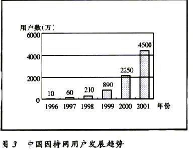 據(jù)CNNIC統(tǒng)計的數(shù)據(jù)表明,到2000年12月31日止,中國的因特網用戶達到2250萬戶,上網計算機892萬臺,預計2001年中國將有超過4500萬的網民。中國域名總數(shù)為12.2萬個,WWW站點數(shù)26.54萬個。中國因特網的發(fā)展速度驚人,與國際因特網的發(fā)展速度相當。中國因特網用戶發(fā)展趨勢見圖3。