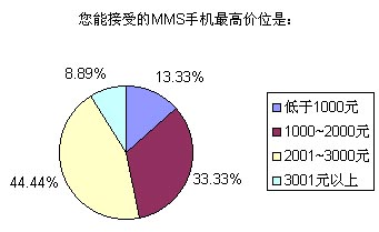 題7對(duì)終端提供商在定價(jià)方面很有幫助的,A~D的答案被選幾率分別為13.33%、33.33%、44.44%和8.89%,看來1000~3000元的價(jià)位是用戶關(guān)注的焦點(diǎn),相對(duì)于現(xiàn)在的市場狀況,終端廠商在將來MMS上面的競爭環(huán)境還是比較友好的,至少價(jià)格上處于買方市場,可以預(yù)計(jì)當(dāng)MMS投入運(yùn)營的頭半年,MMS終端將維持在2500~3500元以上的檔次,6~12個(gè)月以后才會(huì)真的降到2500以內(nèi)去迎合尋常百姓的消費(fèi)能力。