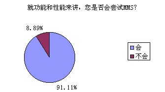 題8的調(diào)查結(jié)果對(duì)于中國移動(dòng)來講絕對(duì)是充滿誘惑的,高達(dá)91.11%的被訪者表示他們非常愿意嘗試MMS的功能和服務(wù),無疑這對(duì)ICP們(MMS服務(wù)的重要載體)也是一針強(qiáng)心劑!