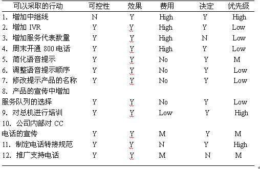 項(xiàng)目小組接下來(lái)對(duì)列舉的眾多原因合并、歸類(lèi)并再次進(jìn)行頭腦風(fēng)暴,并"可控性"、"實(shí)施預(yù)期效果"、"實(shí)施費(fèi)用"、"是否可以由項(xiàng)目小組作決定"、"優(yōu)先級(jí)"等幾個(gè)方面對(duì)可以采取的行動(dòng)進(jìn)行逐項(xiàng)分析(見(jiàn)下圖),最終確定1、5、9、10、11、12項(xiàng)納入到實(shí)施方案,指定相應(yīng)的實(shí)施負(fù)責(zé)人,制定相應(yīng)實(shí)施時(shí)間表,實(shí)施時(shí)長(zhǎng)為三個(gè)月。