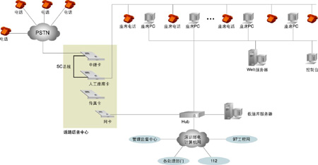 系統(tǒng)的核心是話(huà)路語(yǔ)音中心,主要實(shí)現(xiàn)兩大功能: 一是實(shí)現(xiàn)180系統(tǒng)的話(huà)路語(yǔ)音平臺(tái); 二是實(shí)現(xiàn)與電話(huà)網(wǎng)絡(luò)的接口。以1臺(tái)Pentium級(jí)工控機(jī)作為處理平臺(tái),2塊30線(xiàn)數(shù)字中繼語(yǔ)音處理卡,1塊帶振鈴器的24線(xiàn)模擬座席電話(huà)轉(zhuǎn)接卡,1塊4路傳真卡,卡間以語(yǔ)音處理行業(yè)的標(biāo)準(zhǔn)總線(xiàn)SC總線(xiàn)相連。系統(tǒng)與電信網(wǎng)絡(luò)的接口采用E1數(shù)字中繼線(xiàn),信令方式采用中國(guó)一號(hào)信令為隨路信令,工控機(jī)用TCP/IP協(xié)議與局域網(wǎng)相連。