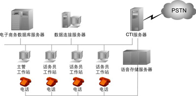 中型呼叫中心:座席代表在50~100之間。據(jù)專(zhuān)業(yè)數(shù)據(jù)統(tǒng)計(jì)公司預(yù)測(cè),中型系統(tǒng)需求量最大,因此不少呼叫中心軟、硬件開(kāi)發(fā)商對(duì)準(zhǔn)這一目標(biāo)進(jìn)行開(kāi)發(fā)。這種系統(tǒng)結(jié)構(gòu)相對(duì)簡(jiǎn)單,投資也少,容易被中、小企業(yè)所接受。目前我國(guó)的一些公司開(kāi)發(fā)系統(tǒng)多屬于此種類(lèi)型。它可以省掉大型交換機(jī)的投資,而利用PBX與CTI服務(wù)器和業(yè)務(wù)代表座席直接相連,業(yè)務(wù)代表席同時(shí)與應(yīng)用服務(wù)器相連,客戶(hù)資料也存在應(yīng)用服務(wù)器中,可實(shí)時(shí)地將接入電話(huà)的客戶(hù)姓名自動(dòng)在計(jì)算機(jī)屏幕上彈出。CTI服務(wù)器一般由CTI硬件開(kāi)發(fā)商的板卡和PC組成,其擴(kuò)容和增加功能也比較方便,成本也低,因此是一種投資小、見(jiàn)效快、升級(jí)也很靈活的系統(tǒng)。