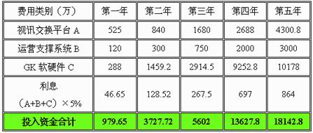 綜合上面三部分成本構成,得出從系統(tǒng)建設并開始運營的頭五年中,各個年份建網(wǎng)資金投入和總投入: