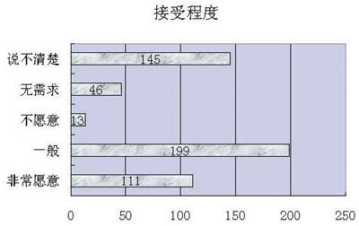 在調(diào)查中,67.4%的用戶對(duì)現(xiàn)有中國(guó)電信的資費(fèi)標(biāo)準(zhǔn)(10元/分鐘)表示不滿,32.6%的用戶表示滿意。但同時(shí)58%的用戶對(duì)能接受的資費(fèi)標(biāo)準(zhǔn)上又選擇了居中和較高的資費(fèi)標(biāo)準(zhǔn),表明用戶對(duì)視訊應(yīng)用產(chǎn)品的價(jià)格承受能力較高。