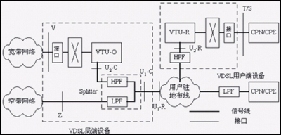 VTU-R分別是位于局端和用戶端的VDSL收發(fā)器。業(yè)務分離器(Splitter,包括HPF和LPF)將同一對電話銅纜上傳輸?shù)腣DSL與窄帶業(yè)務(或ADSL)