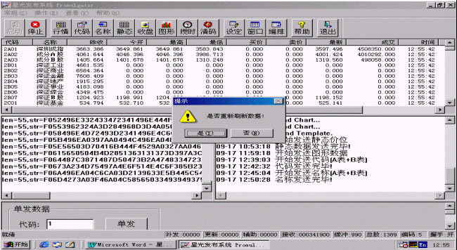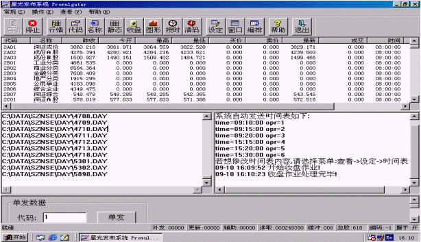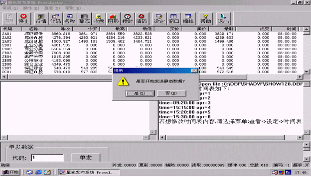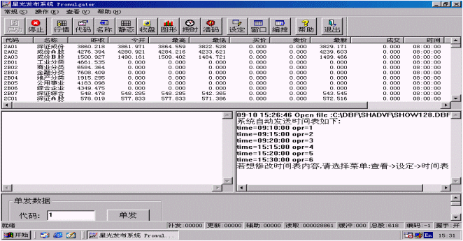 行情也可以單發(fā),只要在進(jìn)行證券信息發(fā)布時(shí)在程序主界面的下方<單發(fā)數(shù)據(jù)>區(qū)輸入要單發(fā)的股票代碼,然后點(diǎn)擊<單發(fā)>按鈕,系統(tǒng)就會盡快刷新該只股票。