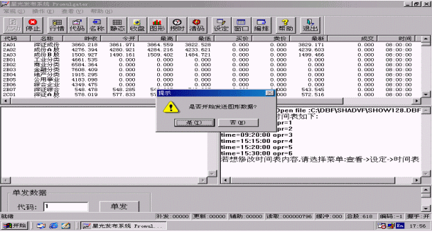 選擇該功能,系統(tǒng)會自動發(fā)送所有指數(shù)和股票的歷史圖形。歷史圖形發(fā)送用時(shí)較長,一般要用一個(gè)小時(shí)左右,它中間的延時(shí)要由信息發(fā)布時(shí)間間隔來定,信息發(fā)布時(shí)間間隔越大,耗時(shí)越長。
