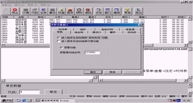 常規(guī)設(shè)置有可選擇<進(jìn)入程序后自動選擇"啟動發(fā)送"功能>、<進(jìn)入程序后自動選擇行情功能>、<報(bào)警功能>及報(bào)警通知地址碼的設(shè)置。啟動報(bào)警功能后,當(dāng)信息源中斷時(shí)系統(tǒng)就會發(fā)出報(bào)警通知。