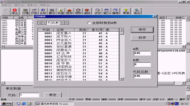 代碼編排是指用戶根據(jù)證券數(shù)據(jù)記錄在數(shù)據(jù)庫中的位置重新排定股票的索引位置,索引次序可不同于證券代碼的次序,也不是數(shù)據(jù)庫中記錄的次序,用戶可根據(jù)需要自己設(shè)定,將來發(fā)布信息時(shí)就按此索引次序(索引號)所指向的股票信息位置取信息進(jìn)行發(fā)布。