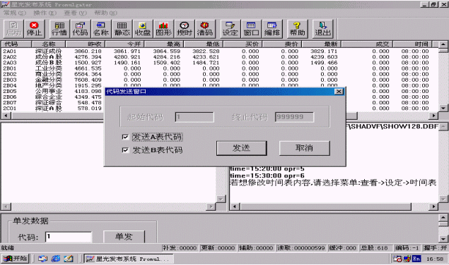 選擇<代碼>按鈕進(jìn)行證券代碼發(fā)布,系統(tǒng)自動彈出<代碼發(fā)送窗口>,如圖3.3