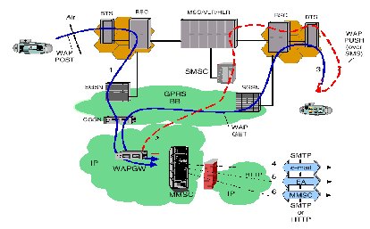 ·圖中第一條消息流顯示了多媒體消息由BTS、BSC、SGSN和GGSN到達IP網(wǎng)絡(luò),通過WAP Gateway被轉(zhuǎn)發(fā)到MMSC中。