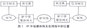 IP中繼媒體網(wǎng)關在IP網(wǎng)絡和電路交換網(wǎng)絡(SCN)之間提供媒體映射和代碼轉(zhuǎn)換功能,即終止電路交換網(wǎng)絡設施(中繼線路),將媒體流分組化并在IP網(wǎng)絡上傳輸,在IP網(wǎng)絡去往SCN的方向也執(zhí)行類似的功能。IP中繼媒體網(wǎng)關在網(wǎng)絡中的位置如圖1所示。