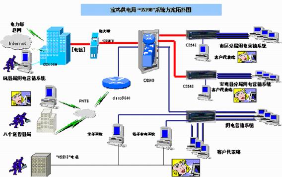 ⑵ 利用現(xiàn)有的計算機網(wǎng)絡(luò)基礎(chǔ)實現(xiàn)市區(qū)供電分局、寶雞縣供電分局、鳳縣供電分局三個供電分局與局客戶服務(wù)中心的信息聯(lián)結(jié);