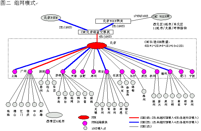 網(wǎng)通的客戶服務(wù)系統(tǒng)(1003呼叫中心)包括位于北京總部的總中心及其它全國30多個城市的分中心,全國范圍共有近200個接入點(覆蓋城市),共有200余座席,由總中心,交換機(jī)遠(yuǎn)端模塊接入點子中心及軟覆蓋接入點組成的三層架構(gòu)。參見下圖一《系統(tǒng)架構(gòu)》及圖二《組網(wǎng)模式》。
