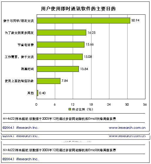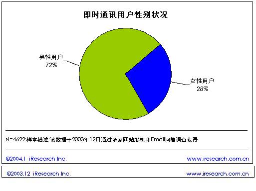 根據(jù)艾瑞市場咨詢(iResearch)的《2003年中國即時通訊研究報告》研究結(jié)果表明,在中國的即時通訊用戶中,72%的即時通訊用戶為男性,占據(jù)了大部分份額。女性用戶僅僅占28%?磥砟行跃W(wǎng)民更喜歡在網(wǎng)上聊天。