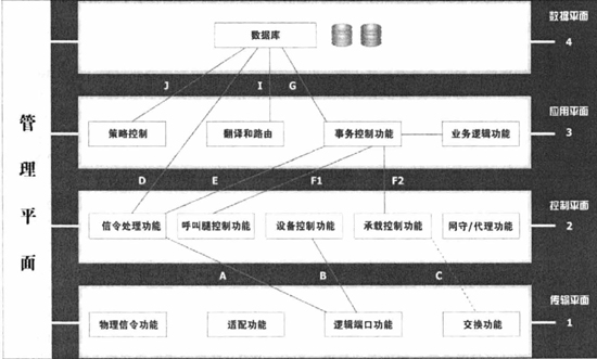 控制平面處于第二層,提供控制功能,如信令處理、承載連接控制、設(shè)備控制、呼叫腿(Leg)控制、網(wǎng)守(Gatekeeper)和代理信令等功能。其中:參考點D位于信令處理功能和數(shù)據(jù)庫功能之間,采用TCAP信令;參考點E在信令處理功能和會話控制功能之間,采用TCAP信令,用于IN請求等傳送,業(yè)務(wù)邏輯對呼叫的控制等消息傳送;參考點F1、F2分別采用呼叫控制API和承載連接控制API,如TAPI、JTAPI等?刂破矫媾c外界的接口2采用H.323(H.225/H.245)、SIP、TCAP(TCAP/SCCP/M3UA/SCTP/IP)等協(xié)議和信令。