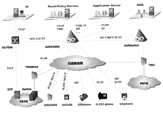 總之,基于IP軟交換的網(wǎng)絡(luò)是一個融合網(wǎng)絡(luò),包括PSTN/ISDN、H.323、ATM/IP等各種網(wǎng)絡(luò)。SIP協(xié)議是NGN多媒體通信協(xié)議,用于軟交換、SIP服務(wù)器和SIP終端之間的通信控制和信息交互,擴展的SIP-T可使SIP消息攜帶ISUP信令;在需要媒體轉(zhuǎn)換的地方可設(shè)置媒體網(wǎng)關(guān),H.248/Megaco為媒體網(wǎng)關(guān)控制器(MGC),用于控制媒體網(wǎng)關(guān),完成媒體轉(zhuǎn)換功能,它并不負責呼叫控制功能;H.323也是多媒體通信協(xié)議,它比SIP、H.248/Megaco的發(fā)展歷史更長,是一項復(fù)雜的協(xié)議,升級和擴展性不是很好,SIP+H.248/Megaco可取代H.323,為了與H.323網(wǎng)絡(luò)互通,NGN必須支持該項協(xié)議;SIGTRAN用于解決IP網(wǎng)絡(luò)承載七號信令的問題,它允許七號信令穿過IP網(wǎng)絡(luò)到達目的地;BICC可使ISUP協(xié)議在不同承載網(wǎng)絡(luò)(ATM、IP、PSTN)上傳送。