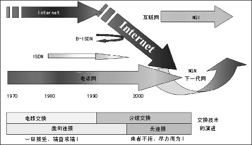 傳統(tǒng)電信網(wǎng)和互聯(lián)網(wǎng)都面臨著挑戰(zhàn),基于電話業(yè)務設計的電路交換網(wǎng)不能靈活適應帶寬各異的數(shù)據(jù)業(yè)務的發(fā)展。專為數(shù)據(jù)業(yè)務設計的互聯(lián)網(wǎng)則存在著安全性、可管理性、商業(yè)模式等問題的困擾。NGI對目前電信網(wǎng)的主要盈利業(yè)務語音的質量保證以及對電信網(wǎng)增長空間很大的業(yè)務(移動)關注不夠。NGI可能達到的目標不能滿足電信界的需要。因此,在NGI之后ITU和ETSI等提出了更高的目標——NGN,這就是NGN的提出背景。信息產(chǎn)業(yè)部電信研究院科技委副主任委員雷震洲認為,兩大亮點點燃了NGN:一是數(shù)據(jù)超過語音的信息需求,全球互聯(lián)網(wǎng)用戶目前已逾7億,全世界在網(wǎng)上傳送的以IP為代表的數(shù)據(jù)業(yè)務量已經(jīng)超過語音業(yè)務量;二是移動超過固定的個性化需求,全球移動用戶已經(jīng)超過13億,近100個國家的移動用戶數(shù)已經(jīng)超過固定用戶數(shù),我國在2003年10月移動用戶也超過了固定用戶數(shù)。