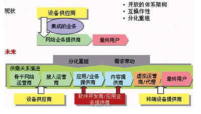 隨著市場對業(yè)務的需求越來越高,運營商扮演業(yè)務開發(fā)者和業(yè)務提供者角色將不再能夠滿足需求,新業(yè)務的提供速度與業(yè)務的種類都逐步處于劣勢,這時運營商需要放棄原來屬于自己的利益,從全業(yè)務提供商逐步演變?yōu)榫W絡提供商和網絡業(yè)務集成商。例如,通過與ICP/ISP的合作,構造NGN業(yè)務價值鏈,提供包括網絡教育、網絡證券等寬帶增值服務;通過開放的Parlay